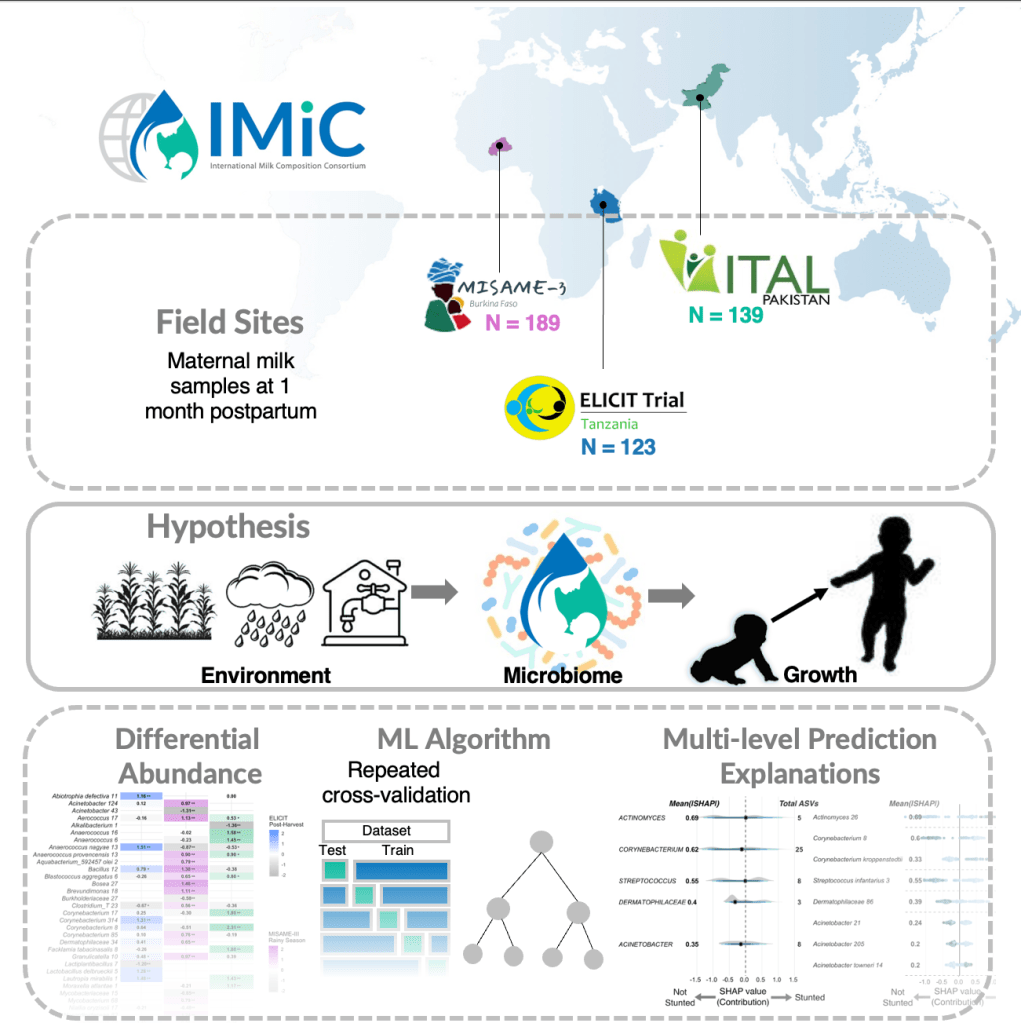 In research led by my IMiC colleage, Lishi Deng, we found associations between milk and infant gut microbiomes in Burkina Faso, and that infant gut microbial profiles predicted future milk composition, suggesting a potential bidirectional pathway of communication between infant and maternal biology.